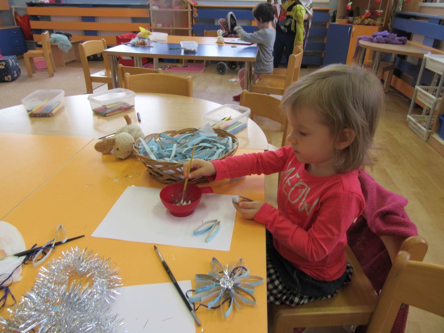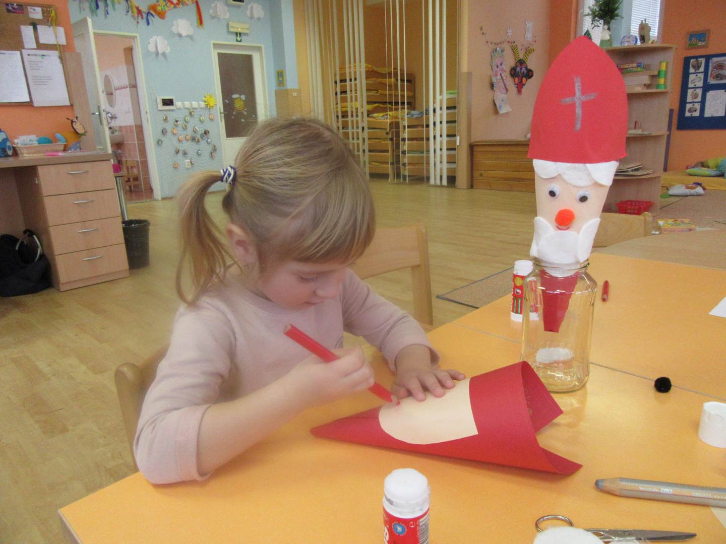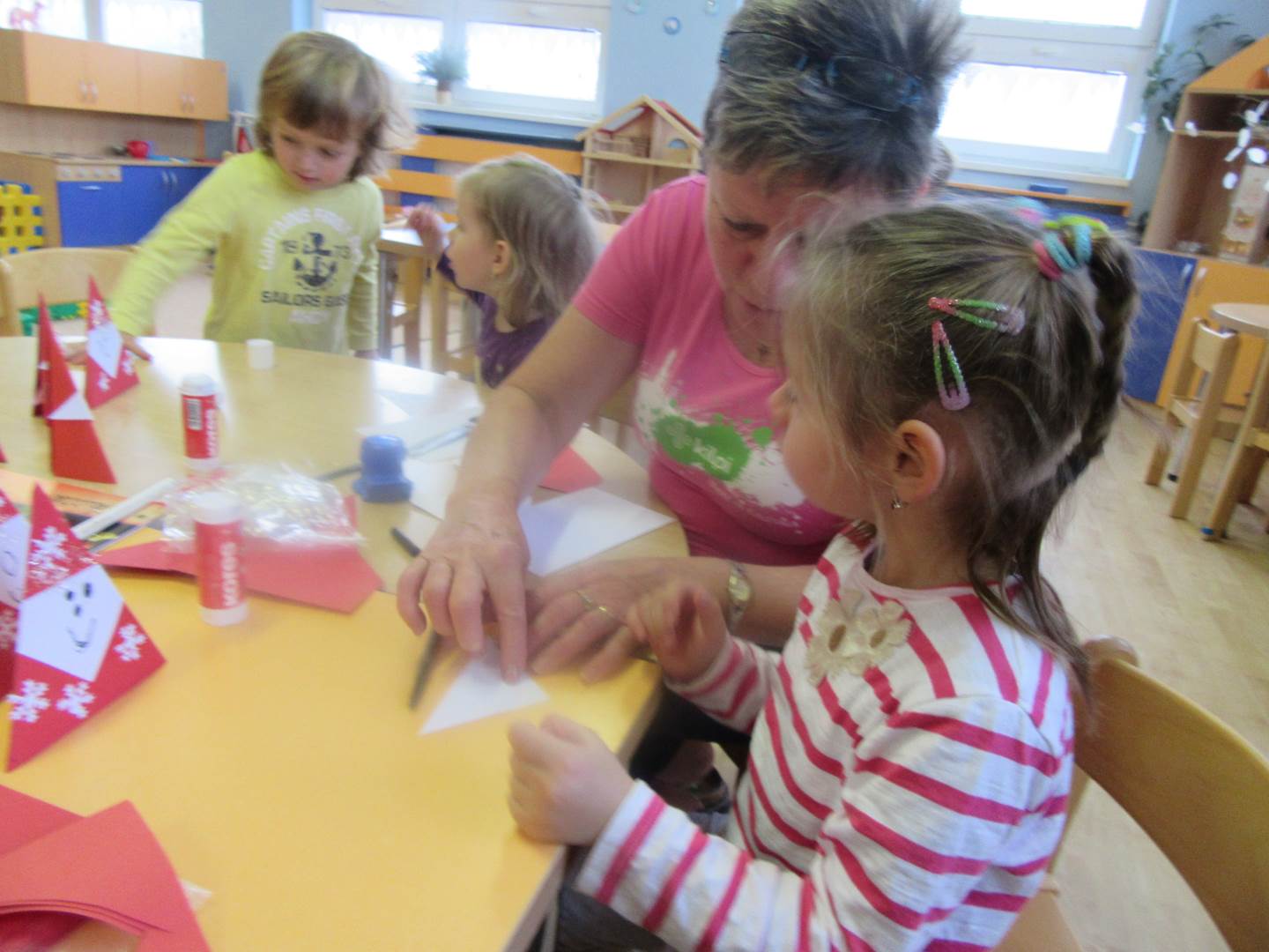 Podzim a barevné listí už jsou fuč a my jsme o krok blíž k vánocům. Protože čas opravdu neúprosně běží , měli jsme tento týden spoustu práce. Začali jsme výzdobou třídy, vytvořili jsme si opravdovou zimu s rampouchy na oknech, přidali jsme také něco vánočního. Protože se nám také blížil Mikuláš, cvičili jsme pylně na besídku. Četli jsme si proč vlastně Mikuláš naděluje, že ho doprovází andílek a čertík. Hlavně jsme si také vysvětlili, že čerti nás nikam neodnesou a jsou hodní.Děti vyráběly ozdoby na náš školkový stromeček a společně jsme zdobili. Nezapomeňte v pondělí na dílničky a rozsvícení stromečku. Moc bych poděkovala rodičům, že přišly s dětmi na besídku. Vaše děti jsou opravdu moc šikovné a hlavně nikdo se nebál a všichni vystupovali!!!!!! Prožívejte spokojeně advent a nepřehánějte předvánoční úklid....