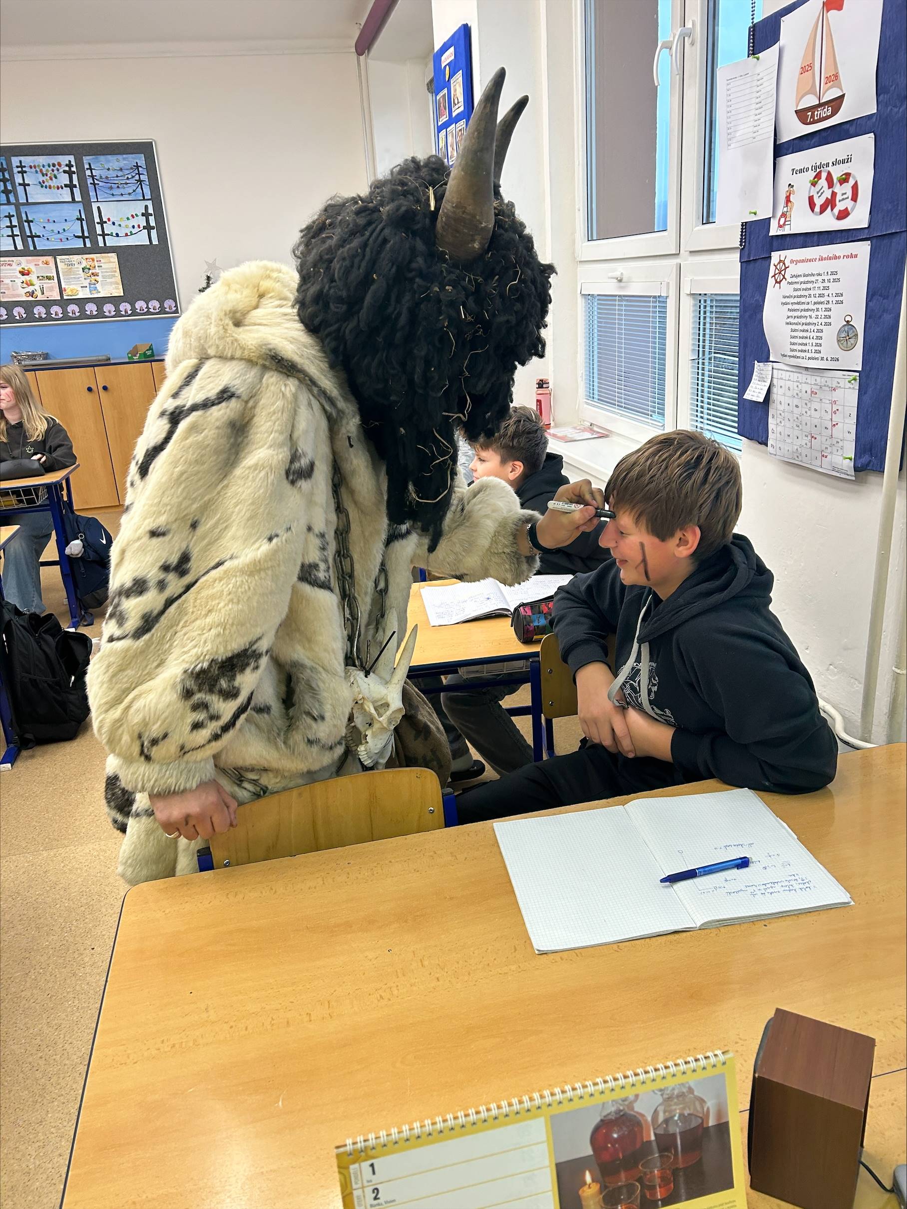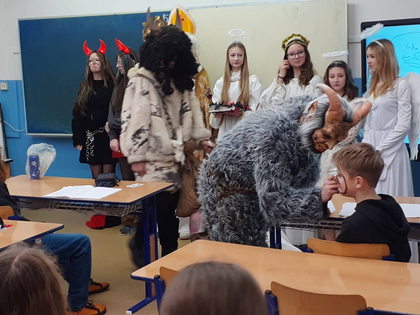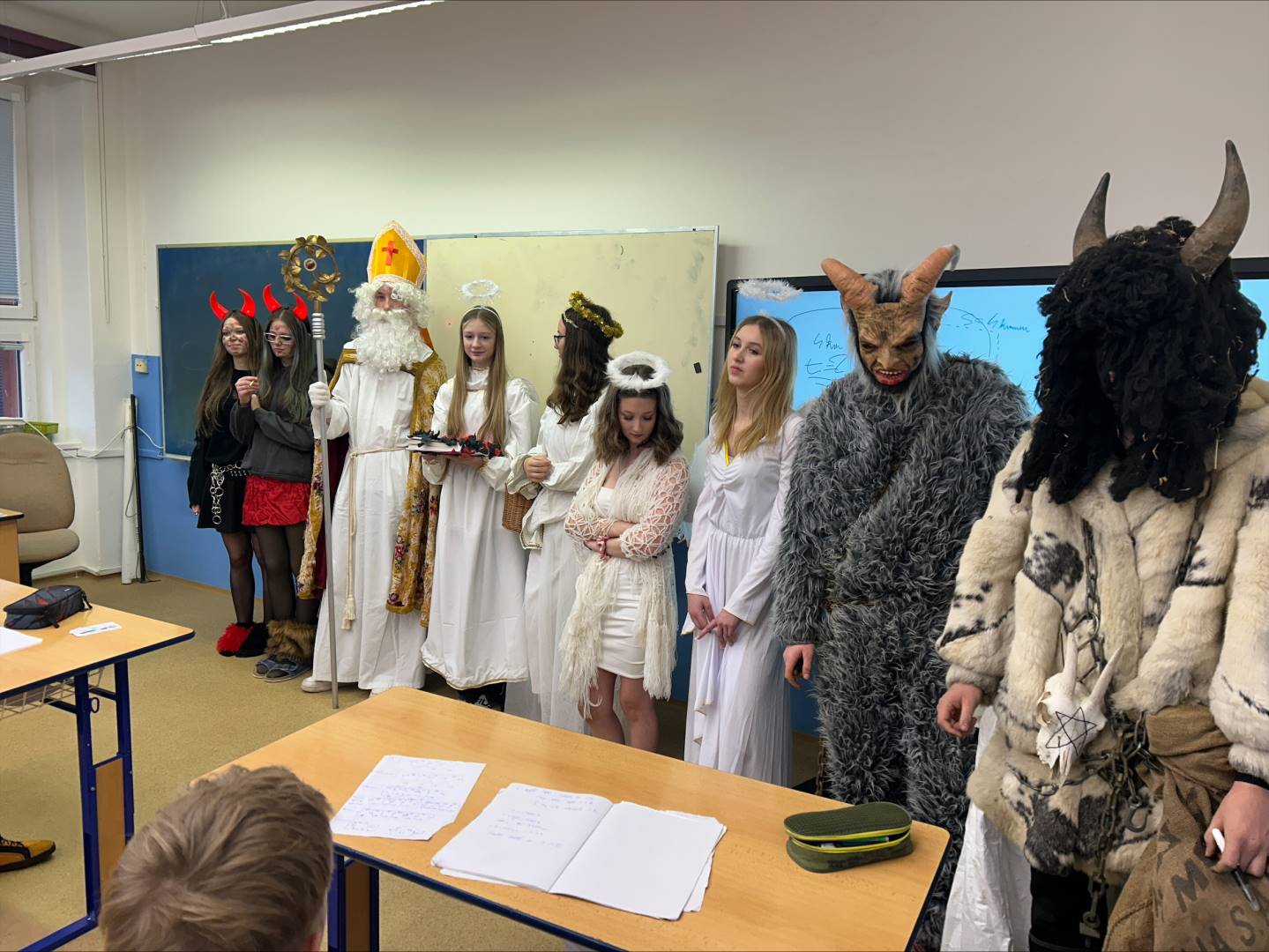 Jako každý rok, tak i letos naši školu navštívil Mikuláš s anděly a čerty. Atmosféra byla veselá – čert sice občas zadrnčel řetězem, ale nakonec zůstal jen na ozdobu. Mikuláš děti pochválil za jejich snahu a kamarádství, ale připomněl jim i drobné slabiny, jako zapomenuté úkoly nebo občasné „závody“ v lavicích. Menší děti si připravily básničky a písničky, které rozzářily celou třídu. Starší žáci se nenechali zahanbit – někteří odříkali matematický vzorec, jiní předvedli zajímavý fyzikální pokus. Všichni si nakonec odnesli sladkou odměnu a pár dobrých rad, jak být ještě lepší.
