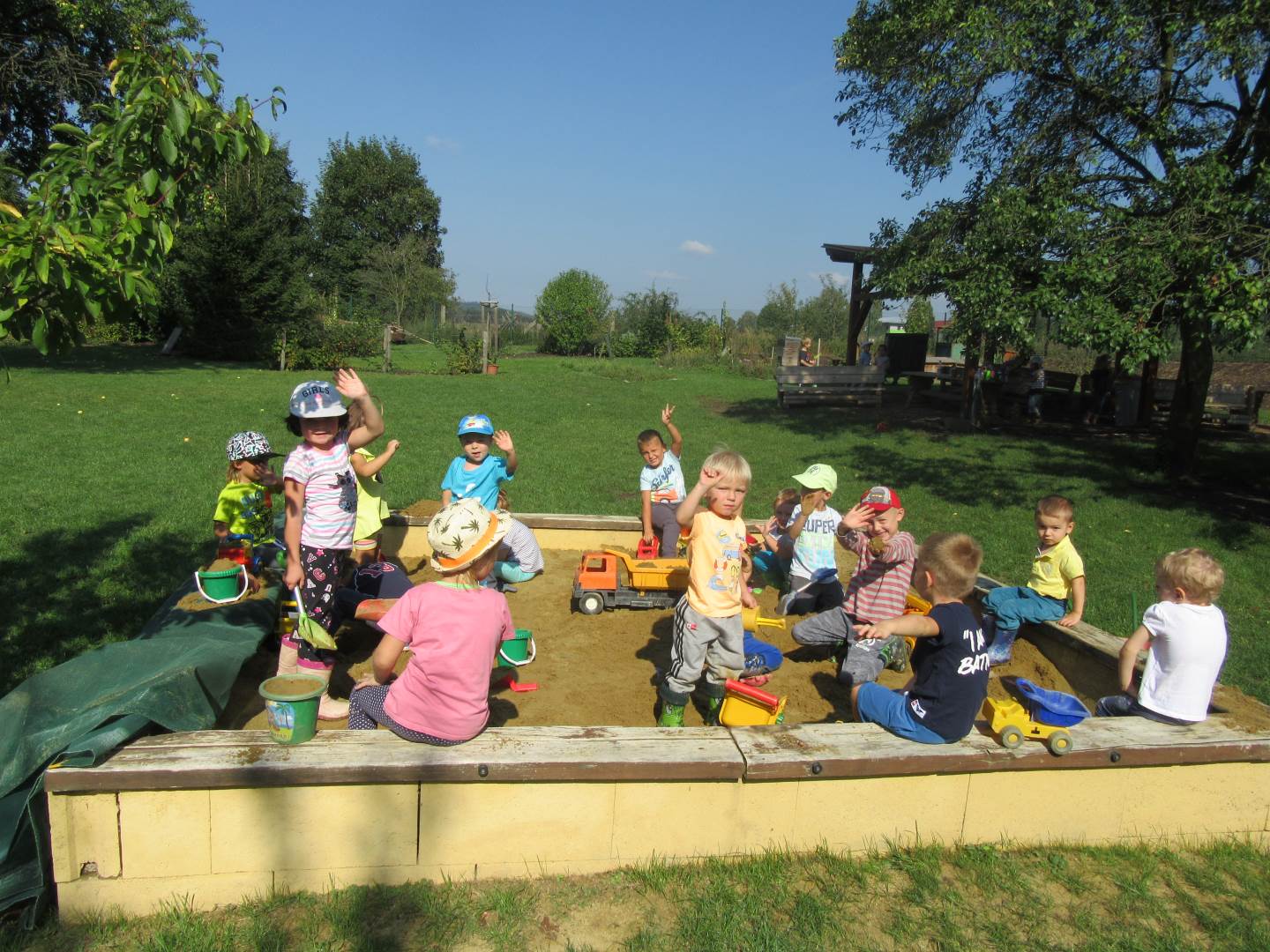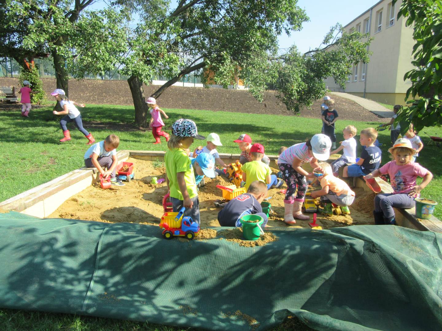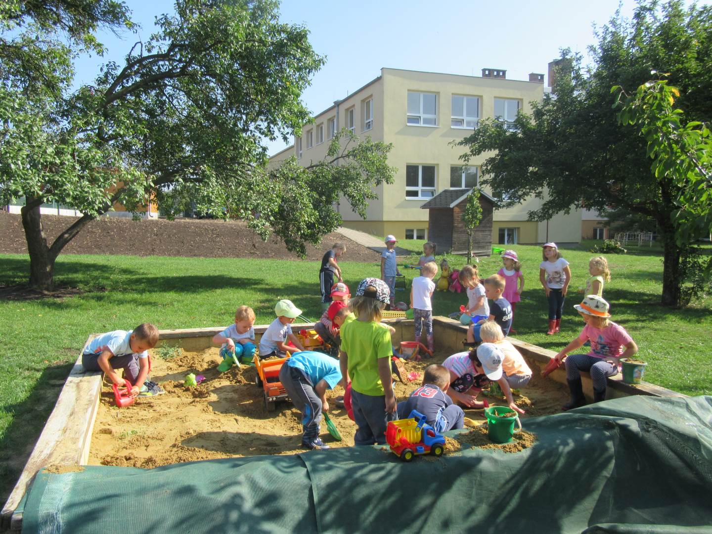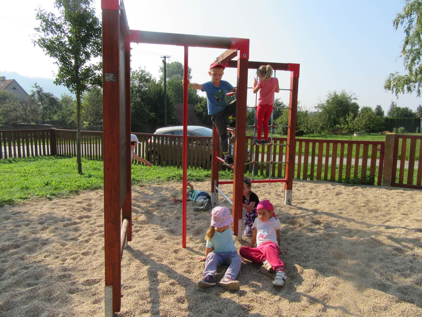 A protože nám přálo ještě krásné sluníčkové počasí, využívali jsme často pobyty venku na obecním hřišti i školní zahradě, kde se děti nejvíce vyřádily na pískovišti, kopci, věži i proutěném housence.