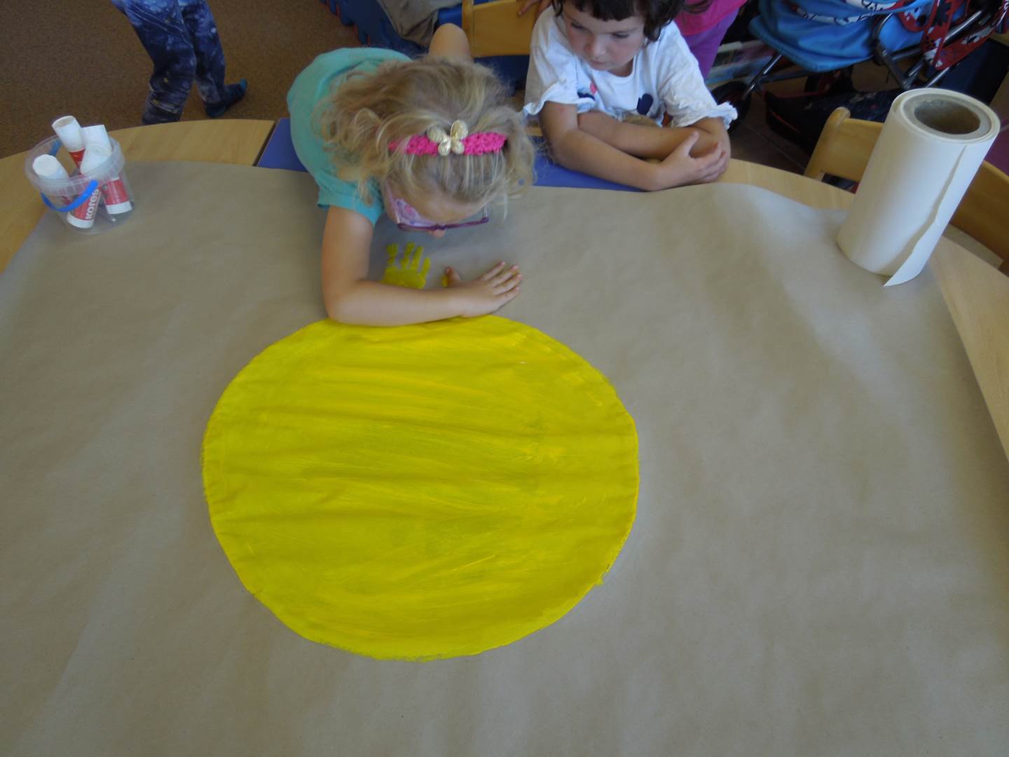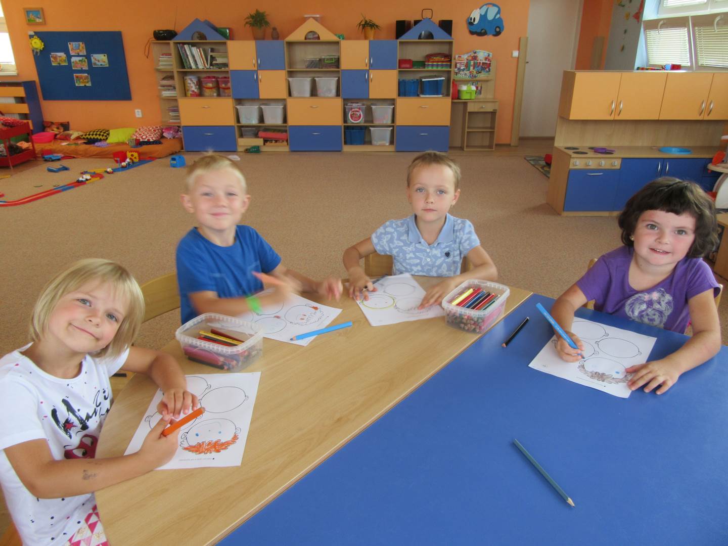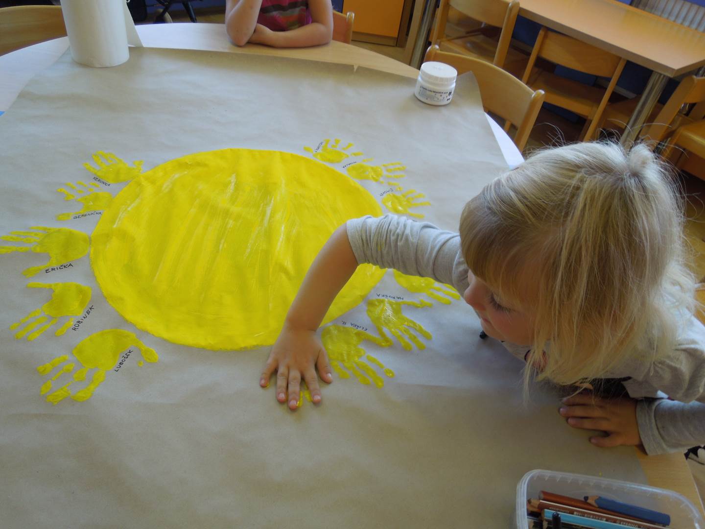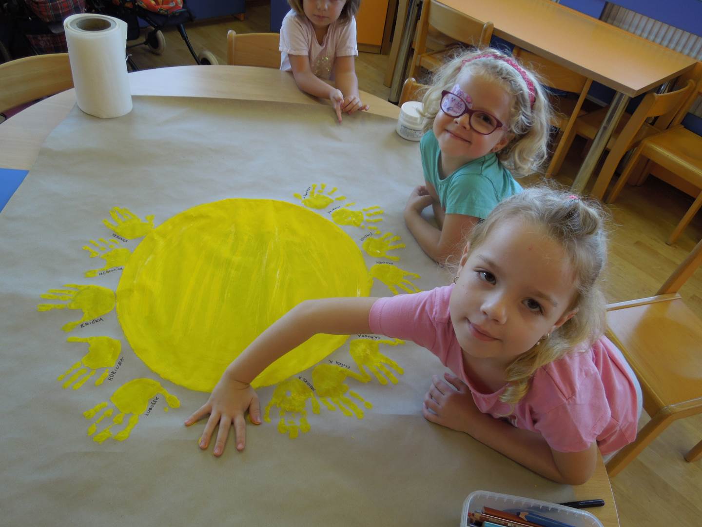 Předškoláci se pilně zapojují do pracovních listů. Společně jsme si vytvořili sluníčko pomocí otisků našich dlaní, které nám zdobí třídu.