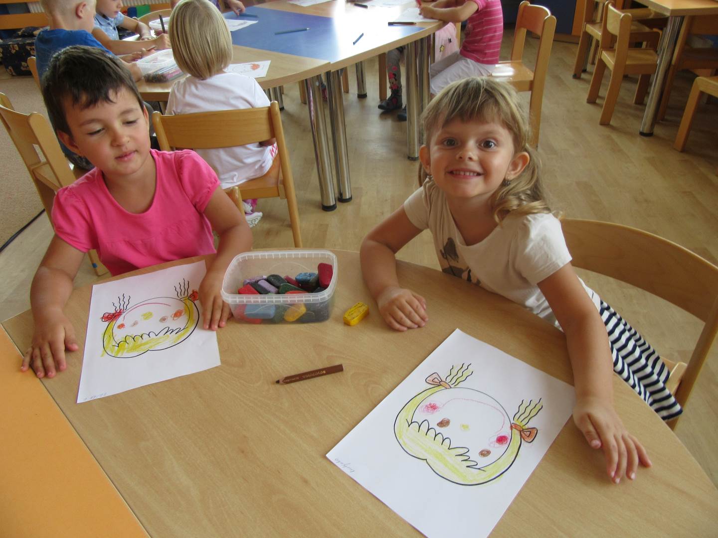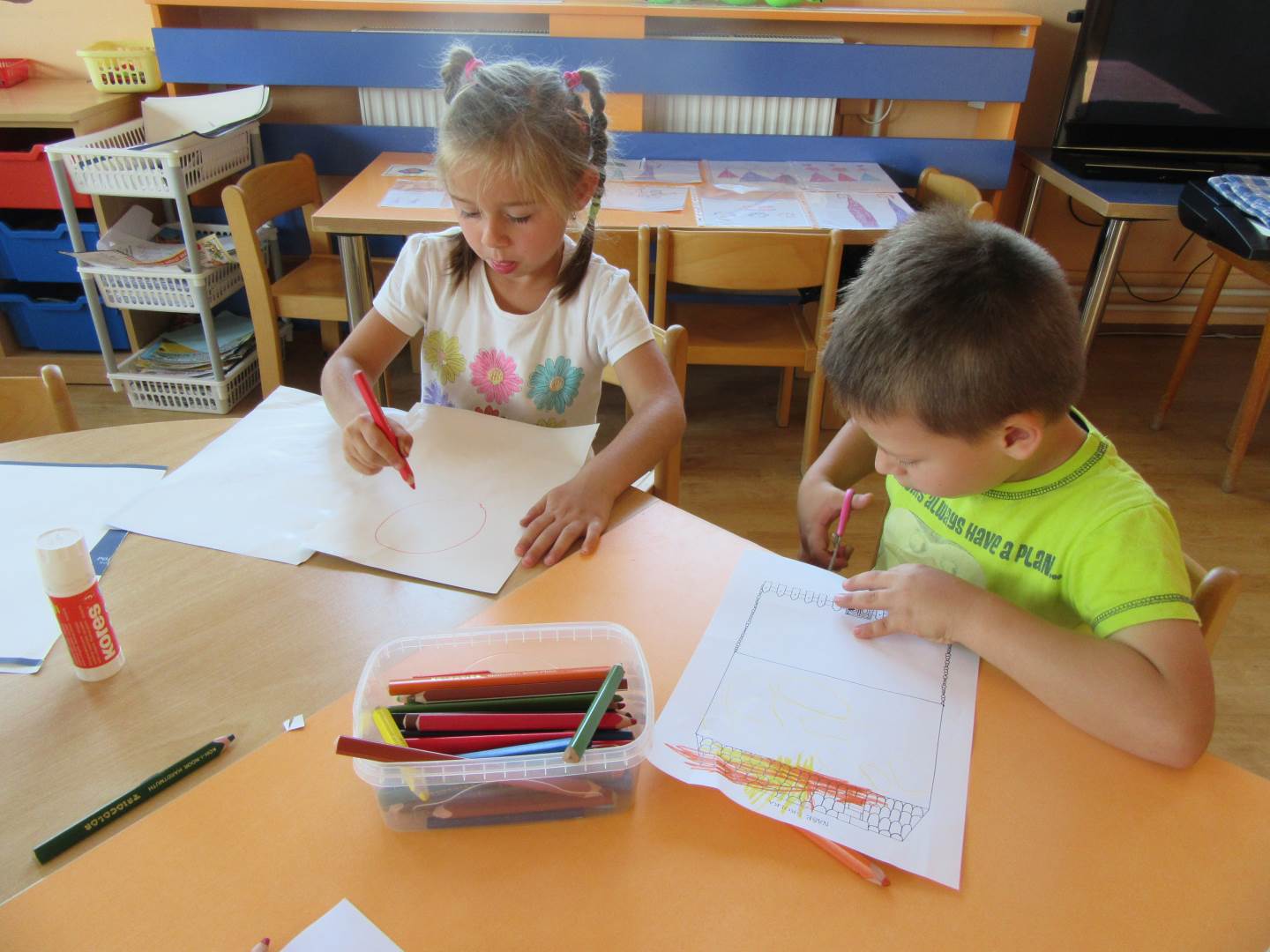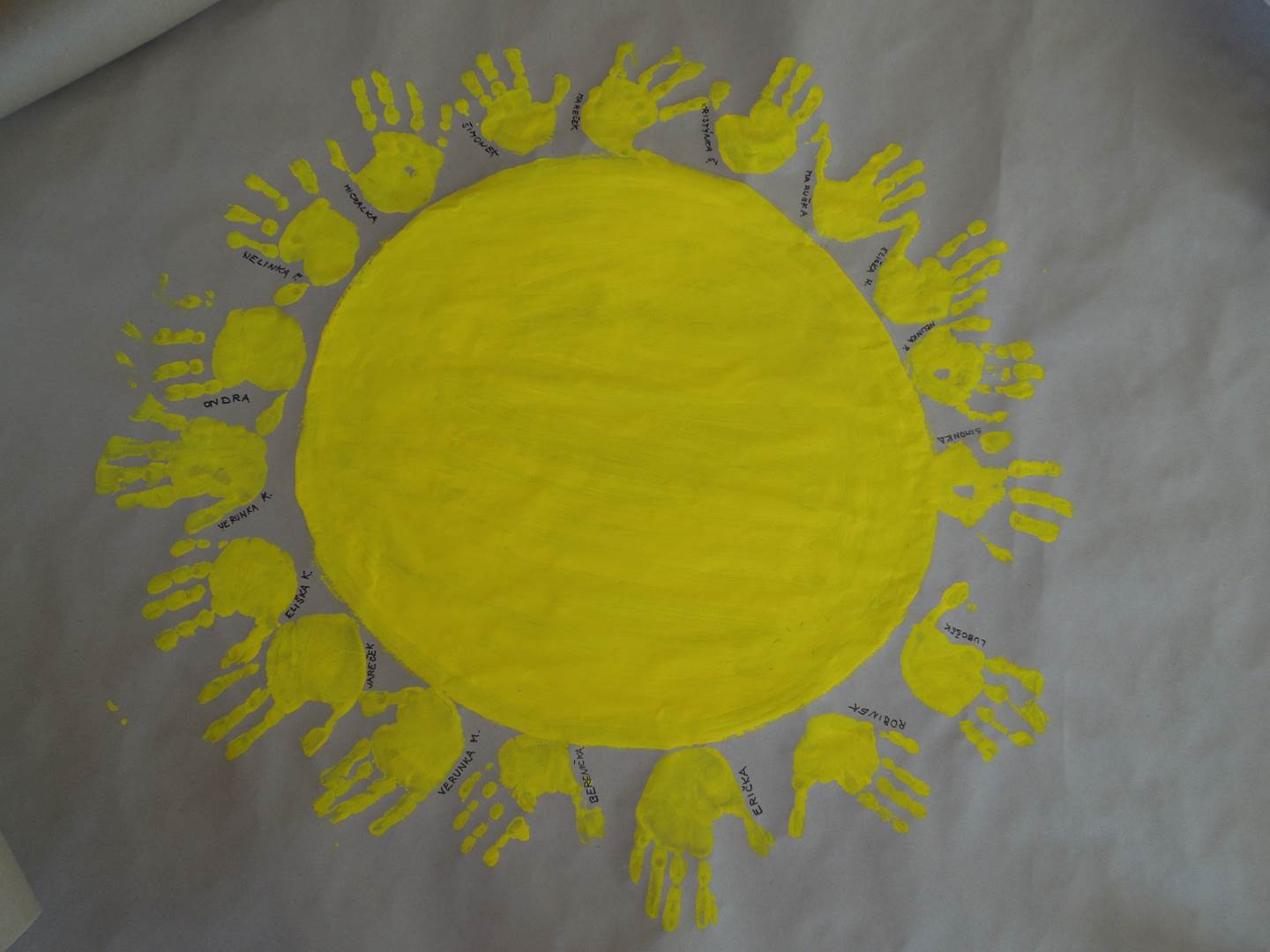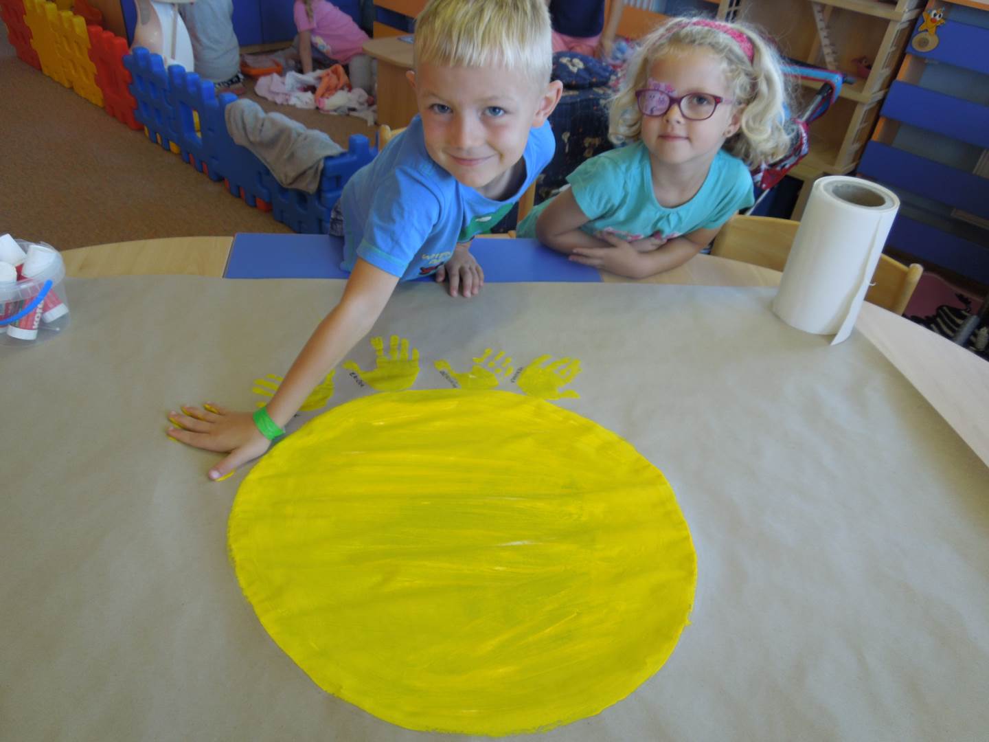 Předškoláci se pilně zapojují do pracovních listů. Společně jsme si vytvořili sluníčko pomocí otisků našich dlaní, které nám zdobí třídu.