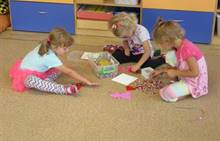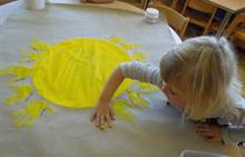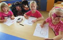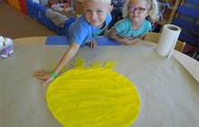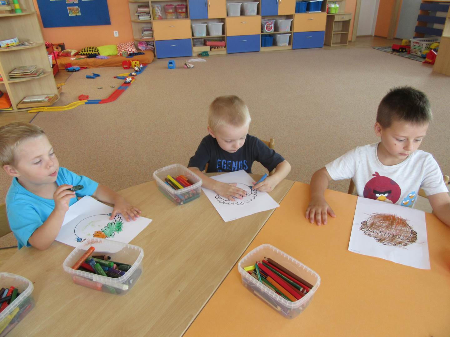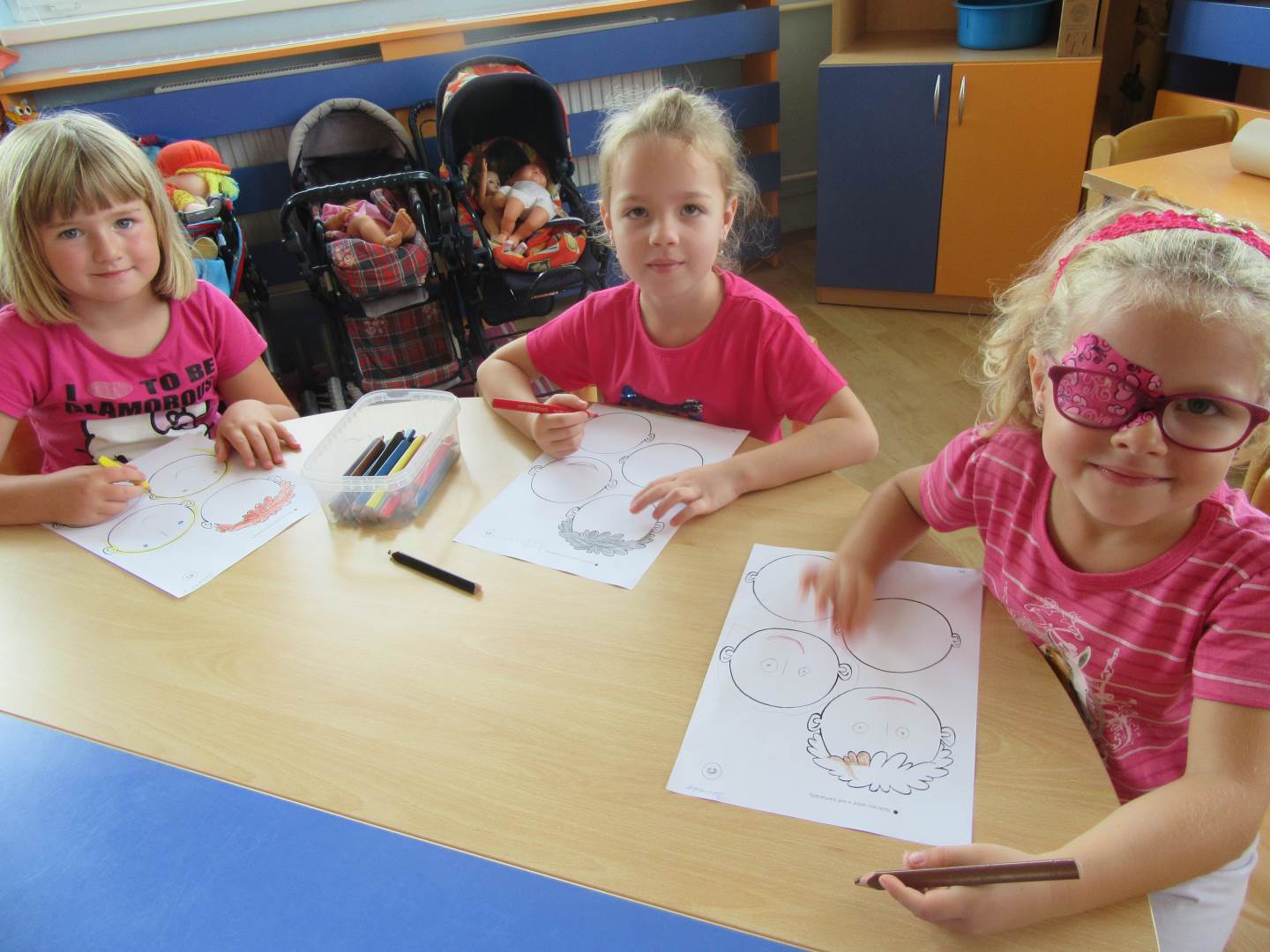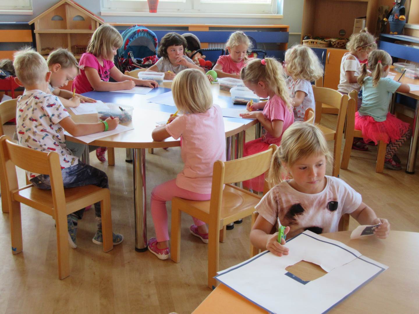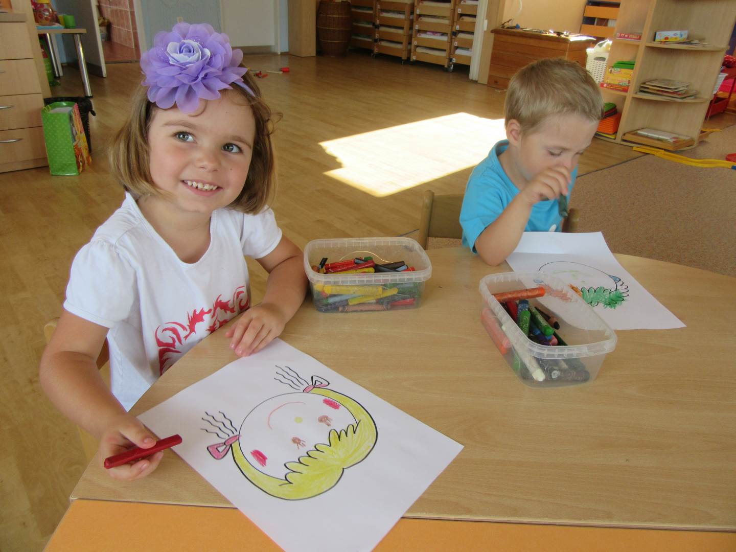 Předškoláci se pilně zapojují do pracovních listů. Společně jsme si vytvořili sluníčko pomocí otisků našich dlaní, které nám zdobí třídu.