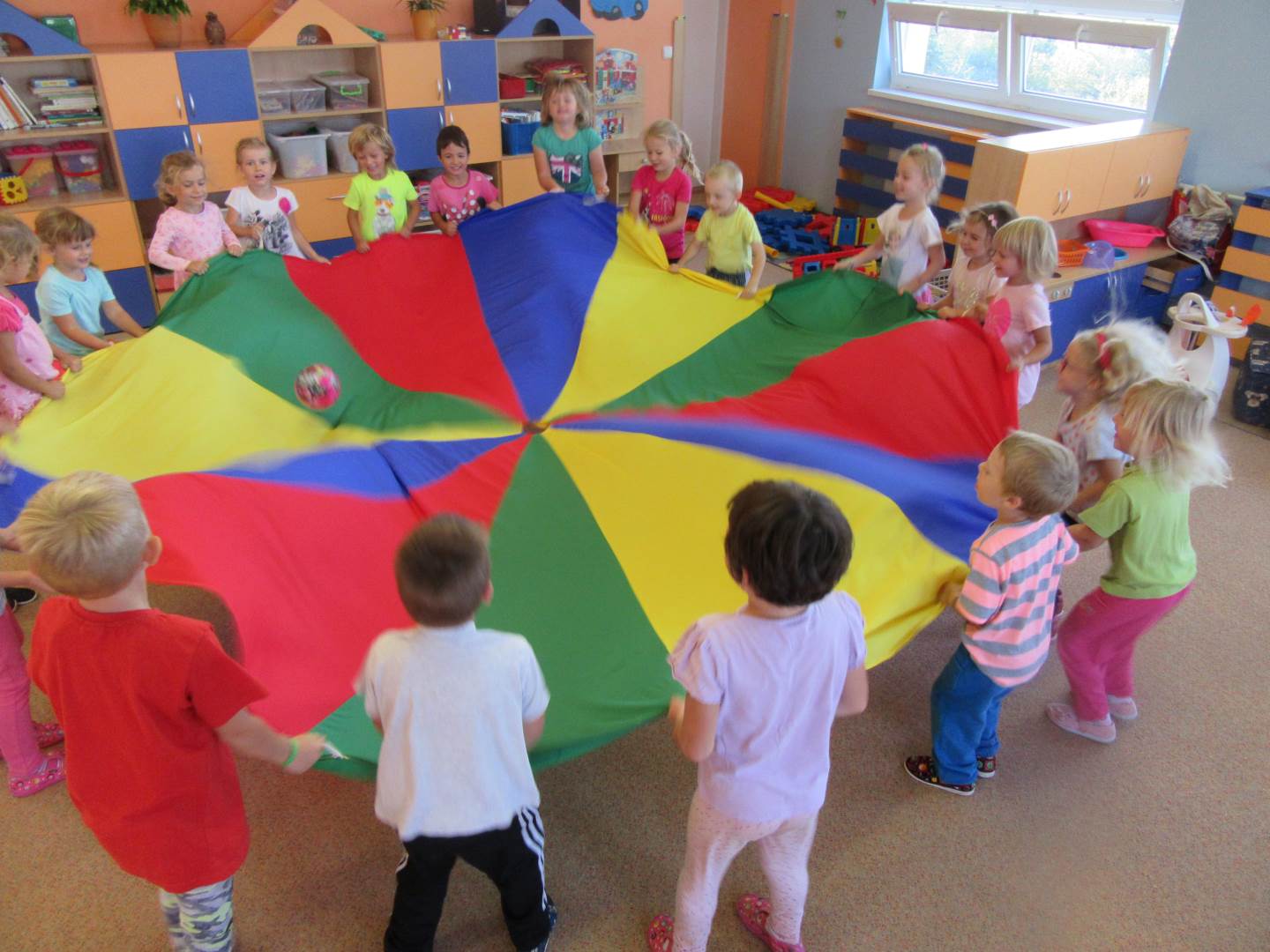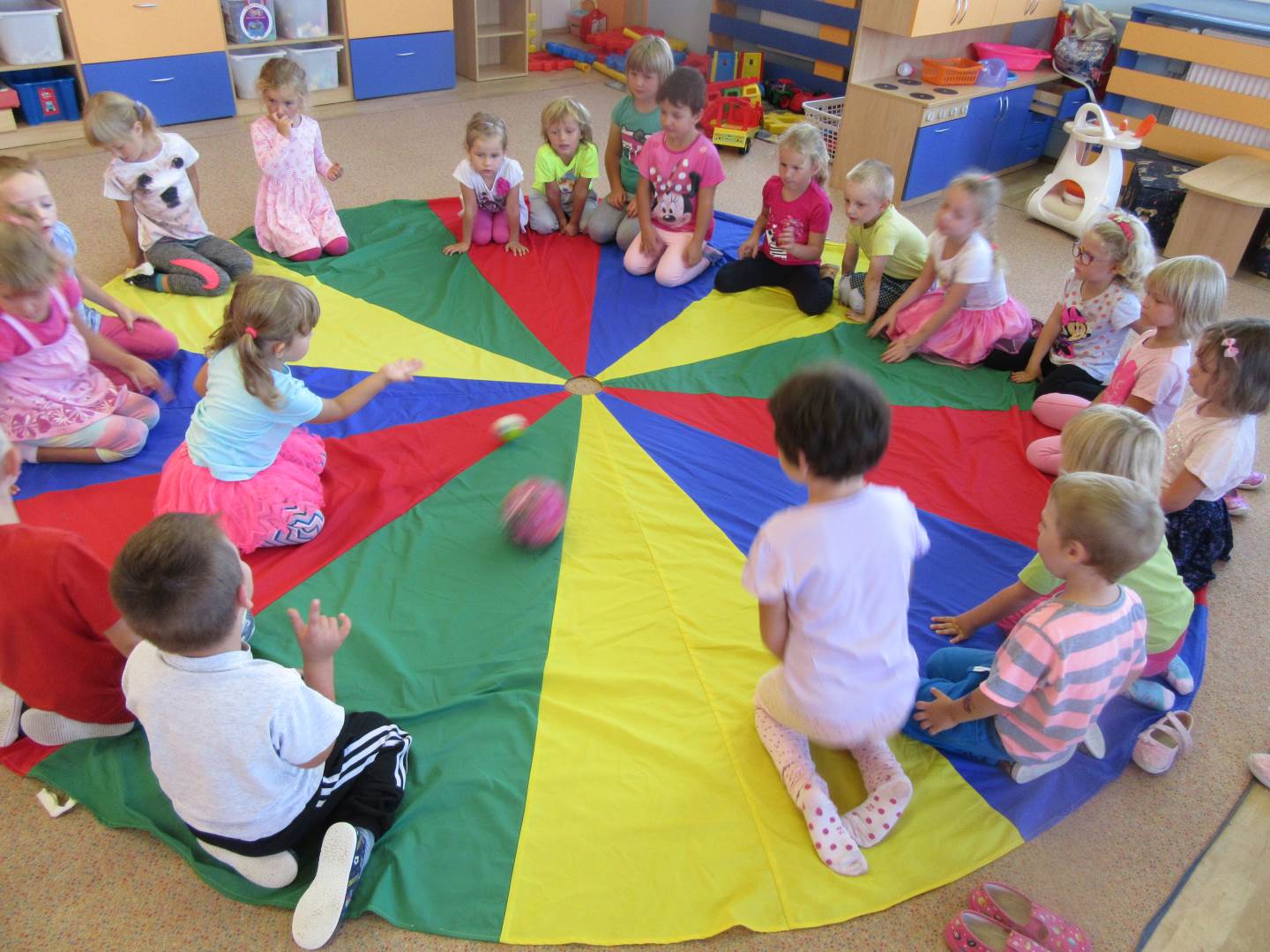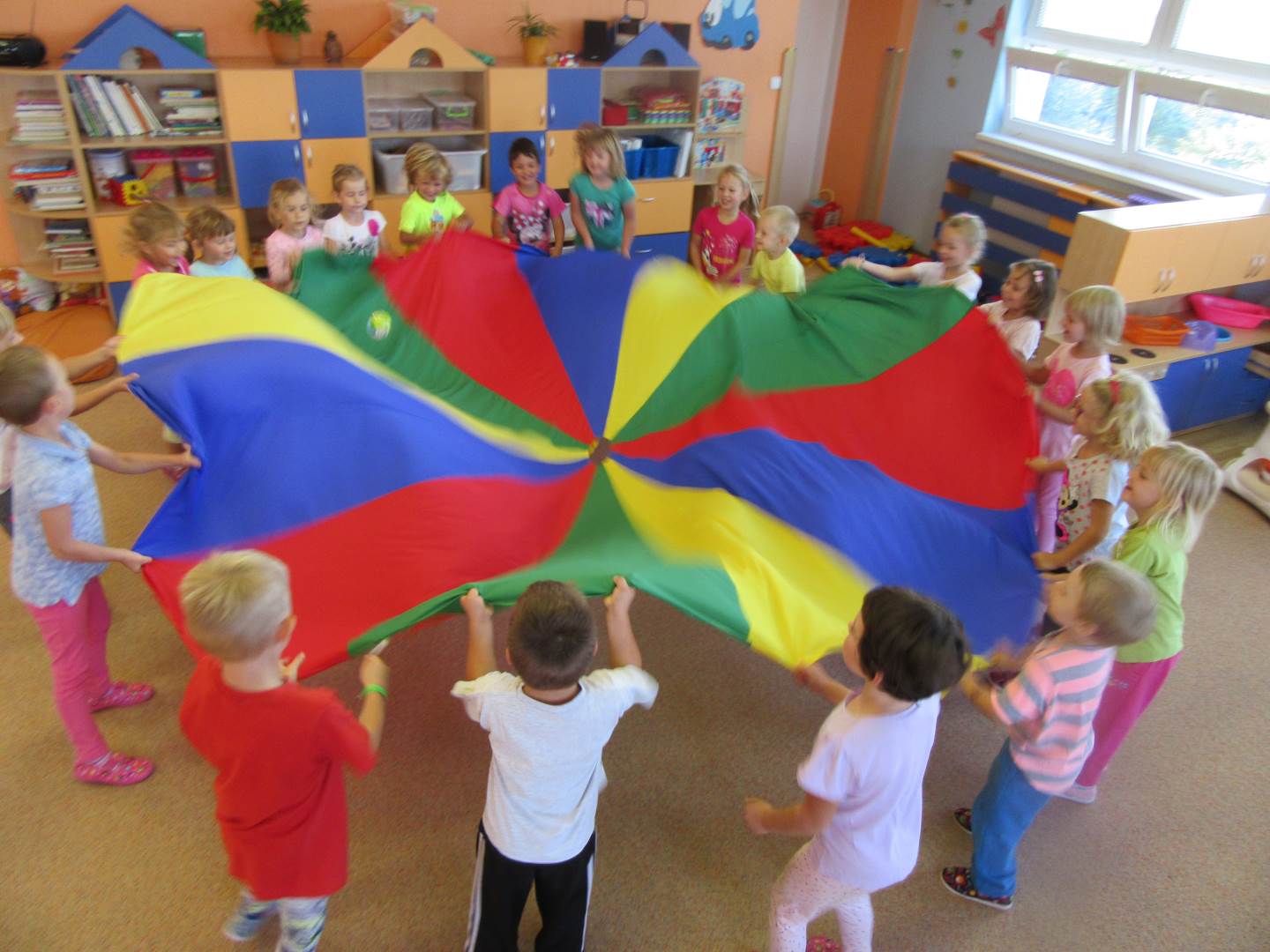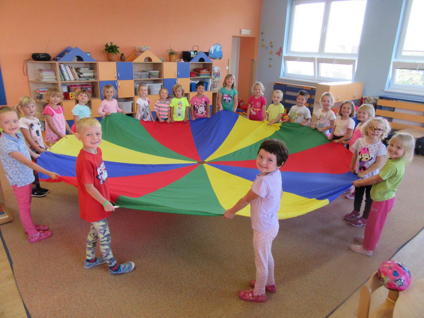 Hráli jsme seznamovací hry s kamarády, upevňovali si svou značku, naučili se písničku Kamarád s doprovodem kláves. Děti si samy určily pravidla třídy, které budou dodržovat, namalovali a zvolili místo ve třídě, kde jsme si je vystavili. Děti byly poučeny o bezpečnosti v MŠ i venku. Cvičili jsme s míčky i padákem, který měl u dětí velký úspěch.