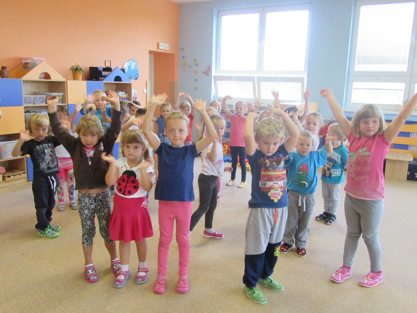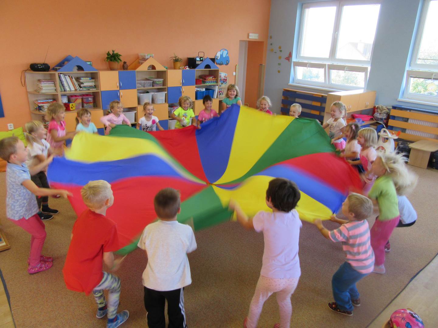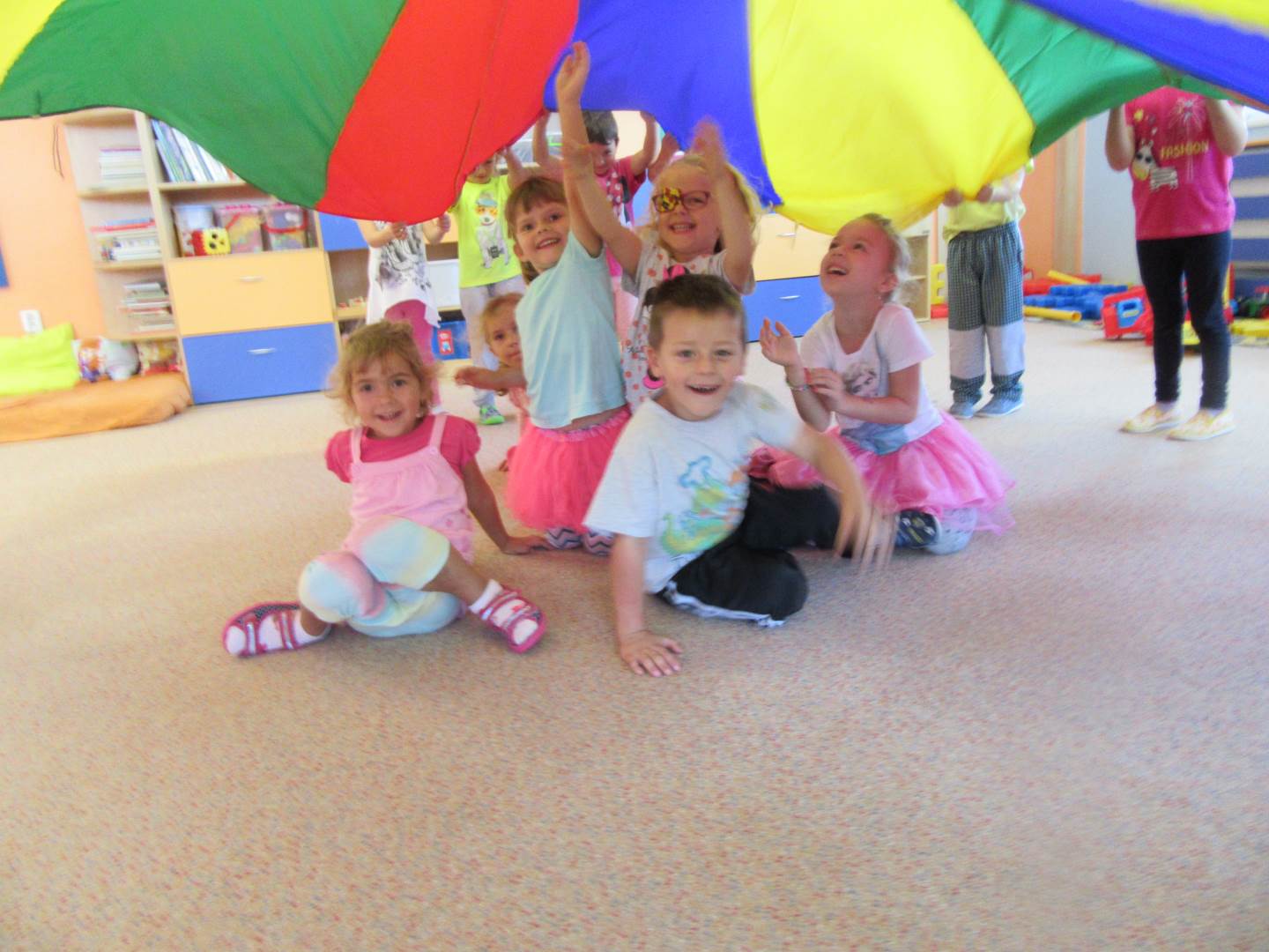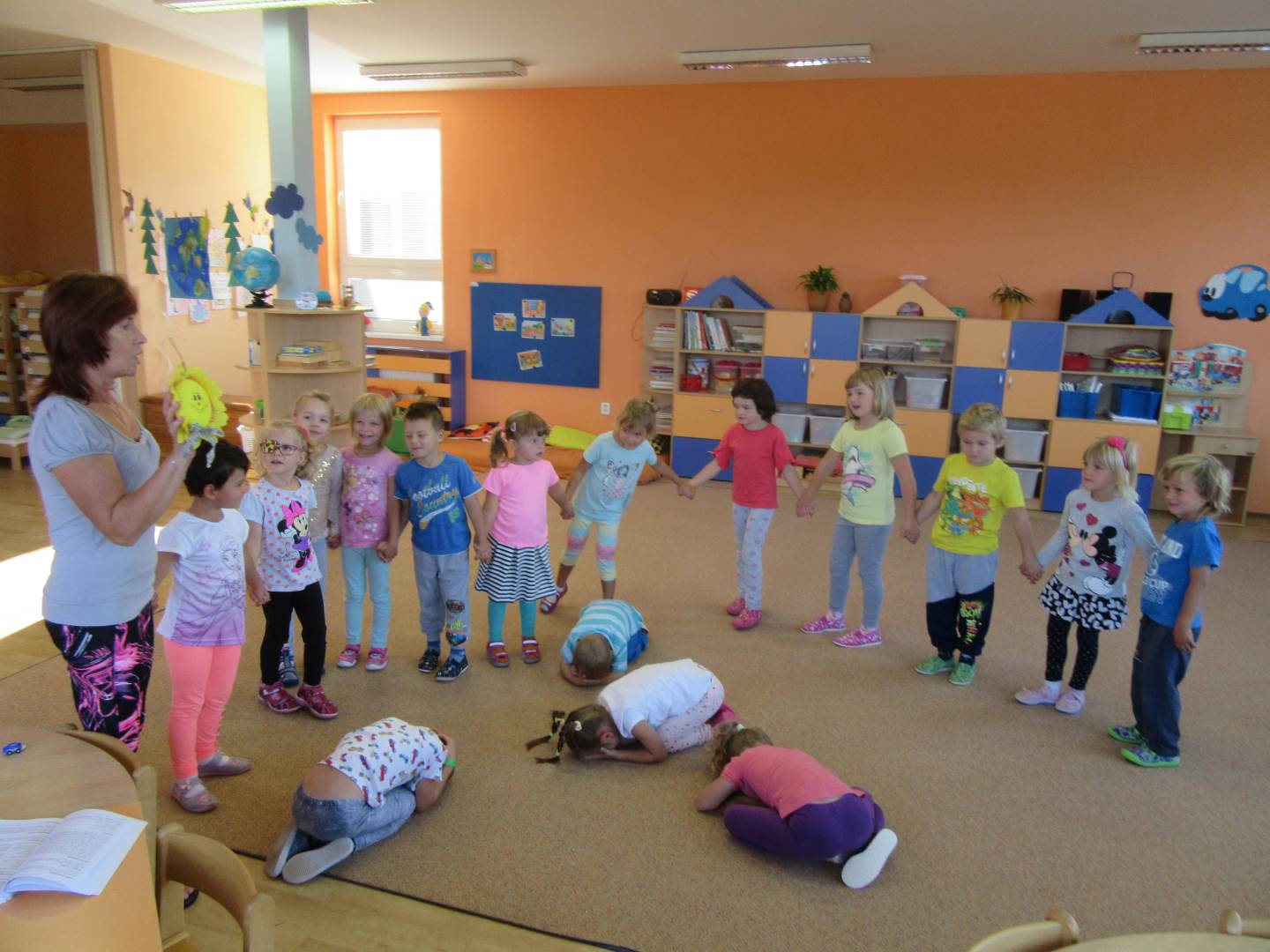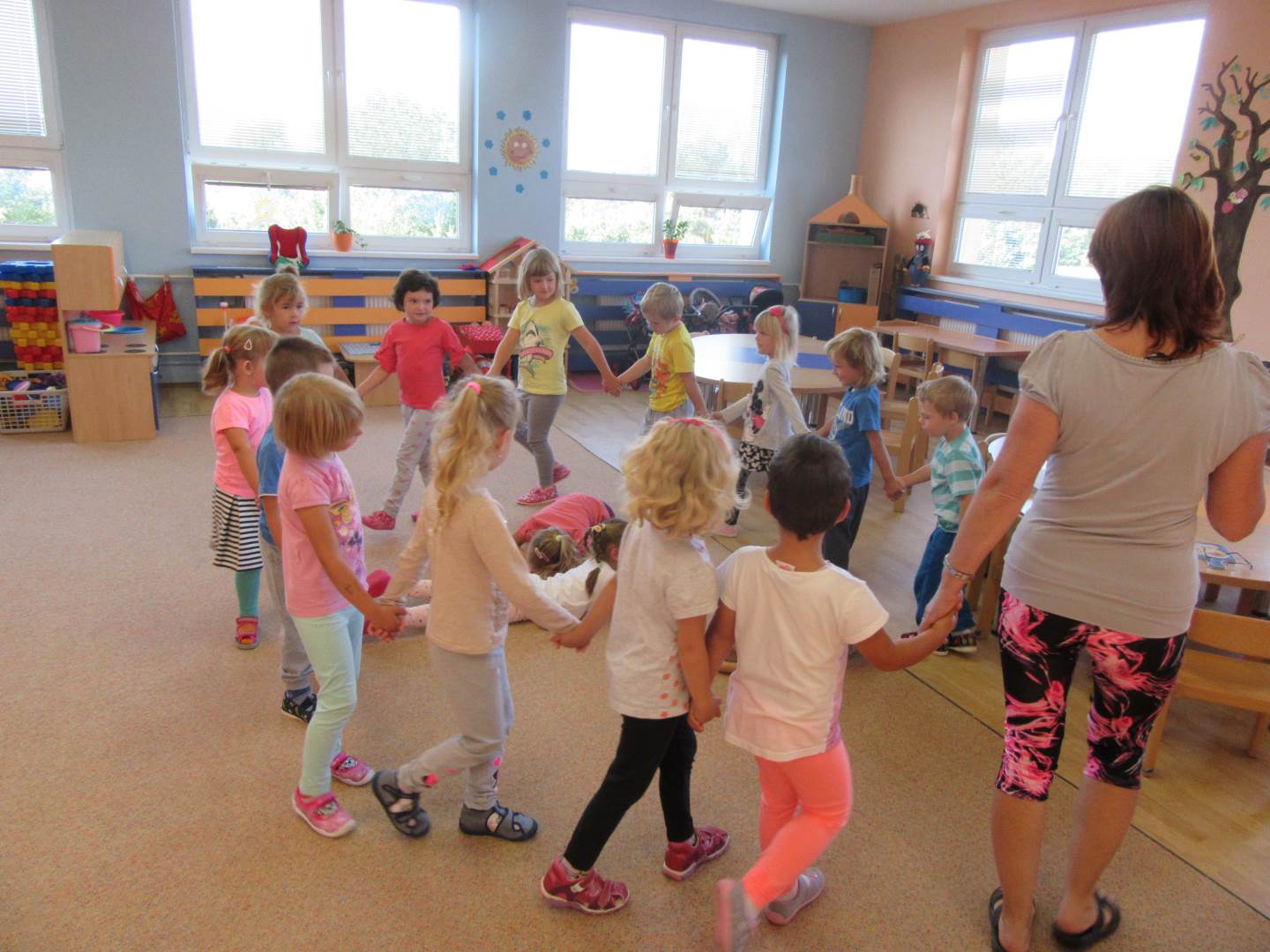 Hráli jsme seznamovací hry s kamarády, upevňovali si svou značku, naučili se písničku Kamarád s doprovodem kláves. Děti si samy určily pravidla třídy, které budou dodržovat, namalovali a zvolili místo ve třídě, kde jsme si je vystavili. Děti byly poučeny o bezpečnosti v MŠ i venku. Cvičili jsme s míčky i padákem, který měl u dětí velký úspěch.