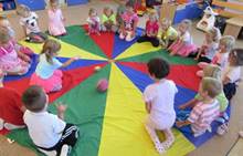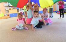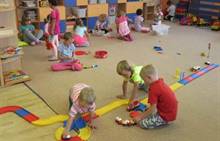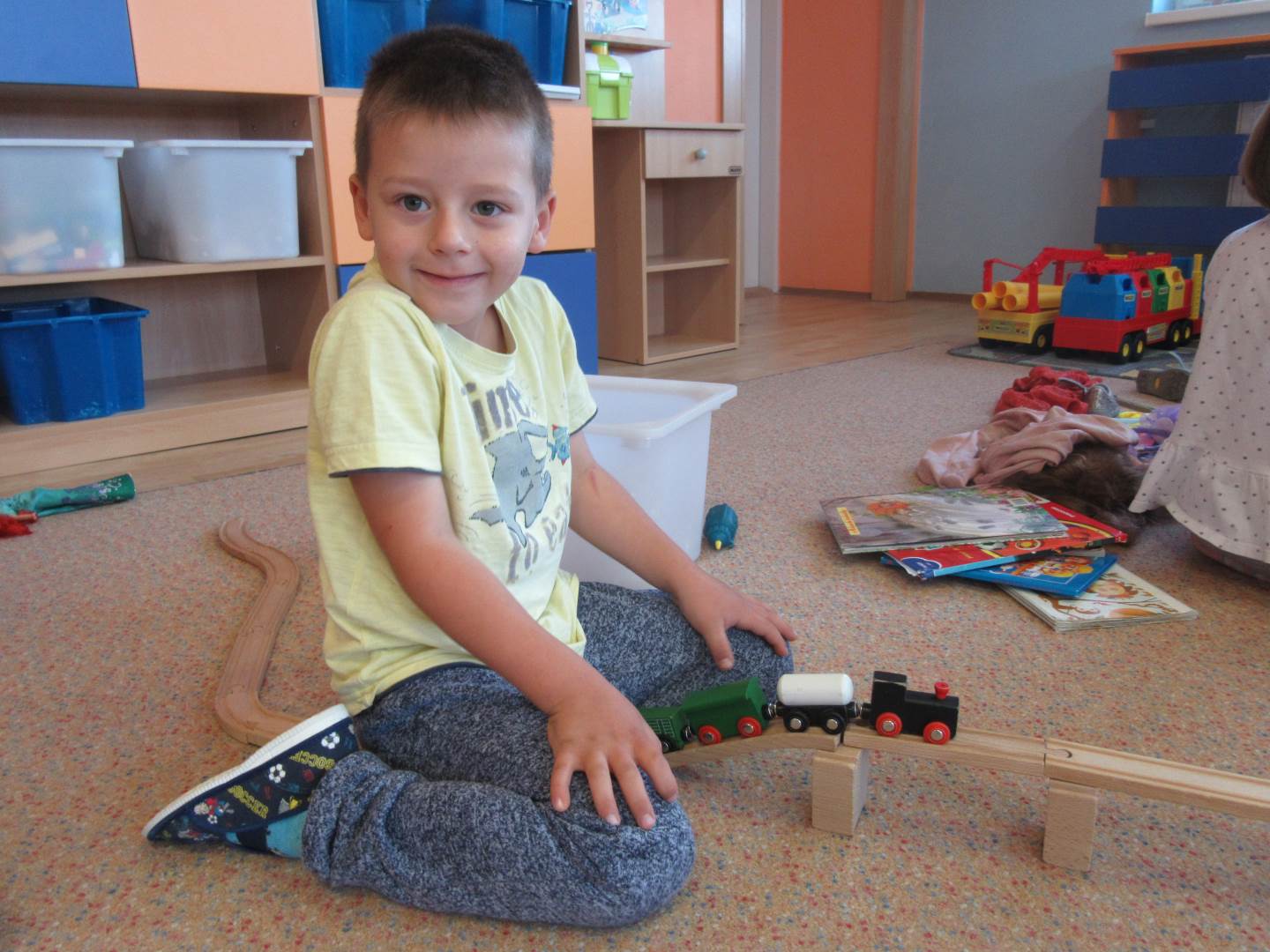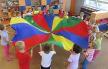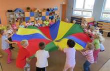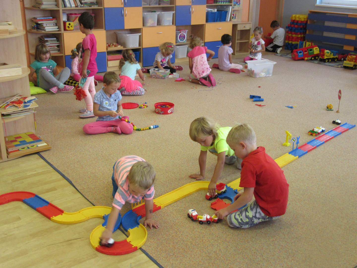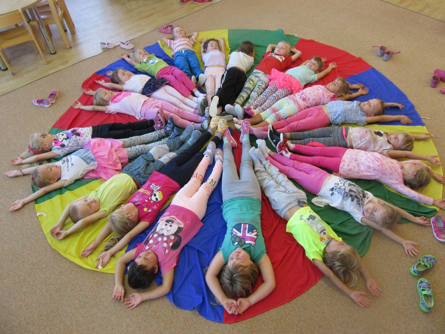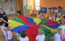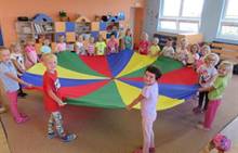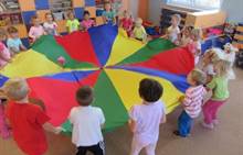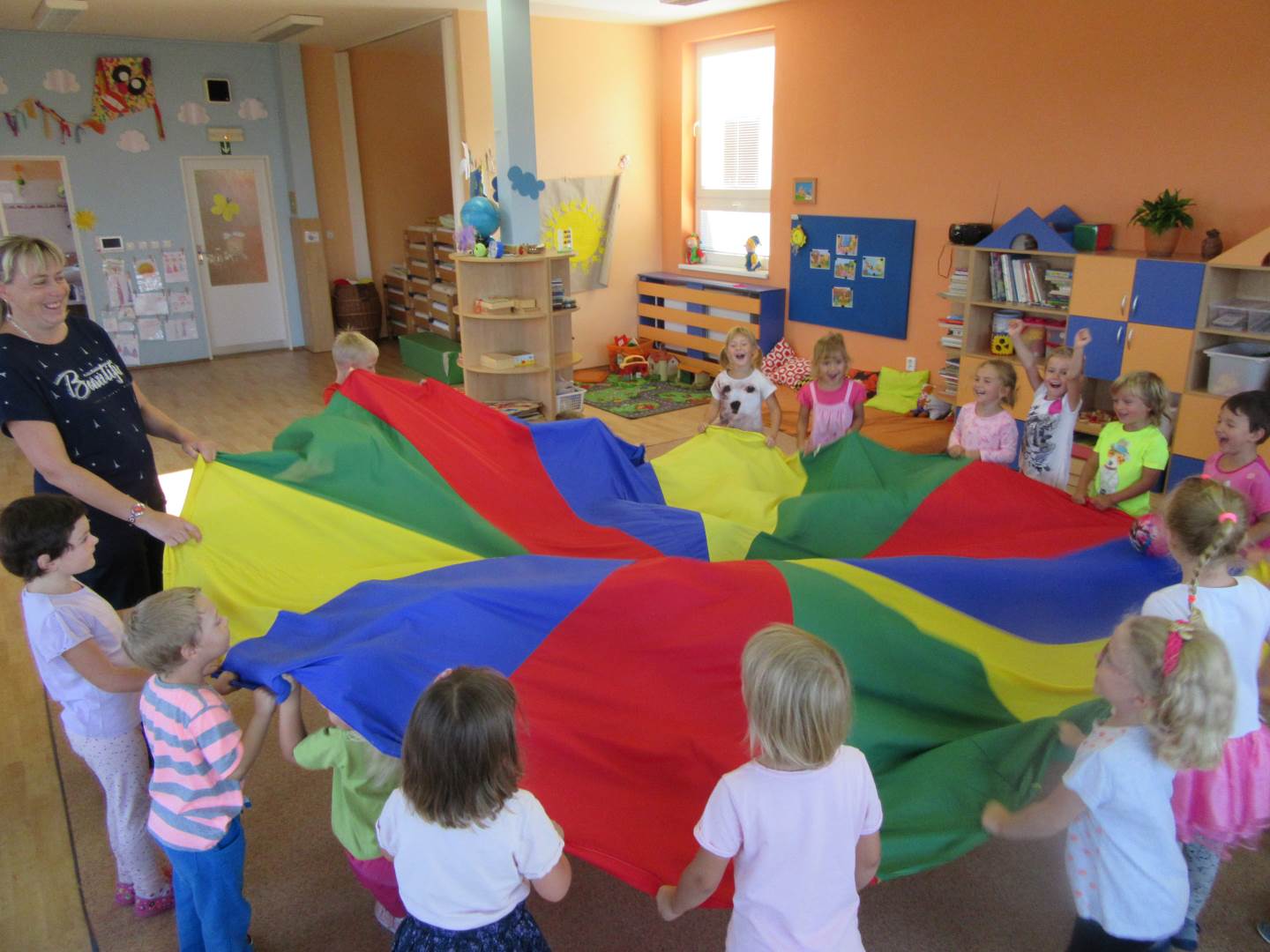 Hráli jsme seznamovací hry s kamarády, upevňovali si svou značku, naučili se písničku Kamarád s doprovodem kláves. Děti si samy určily pravidla třídy, které budou dodržovat, namalovali a zvolili místo ve třídě, kde jsme si je vystavili. Děti byly poučeny o bezpečnosti v MŠ i venku. Cvičili jsme s míčky i padákem, který měl u dětí velký úspěch.