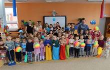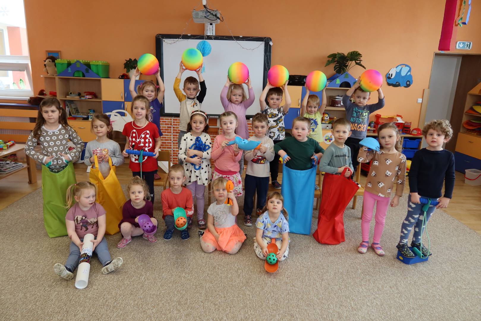 Pořídili jsme létající raketky, duhové vinylové míče, odrážecí pogo, scoopball, animanční podložku Skákací panák, gymnastické hůlky s barevnými stuhami, kreativní padák, lano na přetahování, senzorickou natahovací gumu i sportovní set se skákacími pytli a házecími pytlíky.